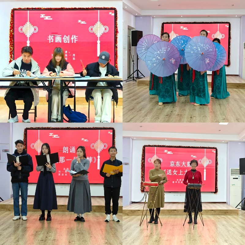 活动现场,社区长者与青年学生同台献艺,联袂呈现了一场情意交融、形式多样的文艺演出。歌声嘹亮,舞姿翩跹:《苹果香》《套马杆》以昂扬旋律点燃全场,尽显青春风采;古典舞《探窗》轻舒曼转,一颦一步间尽显东方韵致;诗朗诵《就是那一只蟋蟀》声情并茂,引人入胜。此外,书画创作笔墨酣畅,魔术表演趣味十足;京东大鼓铿锵有力,戏曲唱段婉转动听,三句半表演更是节奏明快、诙谐生动。一个个精彩节目轮番上演,不断将现场气氛推向高潮,赢得阵阵掌声与喝彩。整场演出既呈现了中华优秀传统文化的深厚魅力,也展现了新时代青年积极向上、多才多艺的精神风貌,为老人们带来一场温暖精彩的文化盛宴。