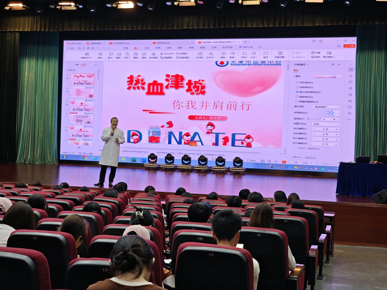 6月10日,校团委联合天津市血液中心共同举办 “热血同行,为爱接力”无偿献血主题公益宣讲会暨青年大讲堂,旨在普及献血知识,号召师生积极参与无偿献血公益行动。主讲人彭云杰医师通过详实的数据和生动的案例,为现场师生带来了一场内容丰富、意义深刻的宣讲,校团委干部、校红十字会骨干成员,以及各学院300余名学生代表参加了本次讲座。